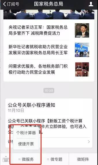 路径二:关注并打开“国家税务总局微信公众号”,点击“微服务”菜单——查看使用“个税计算器”。