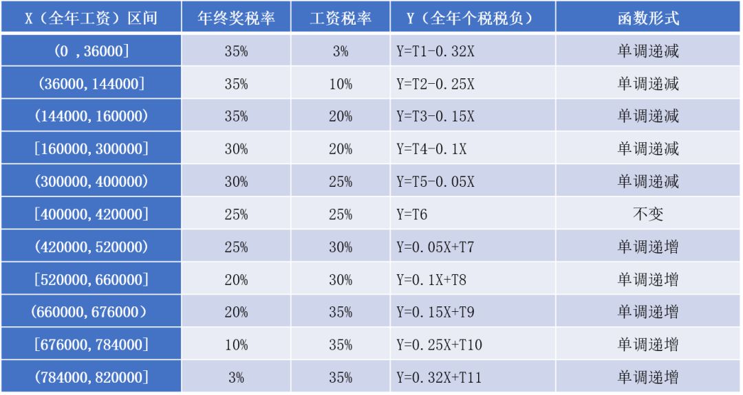 1、针对一个既定的全年工资性收入,一定存在一个唯一的工资和年终奖分配数额,能实现全年税负最低或最高;