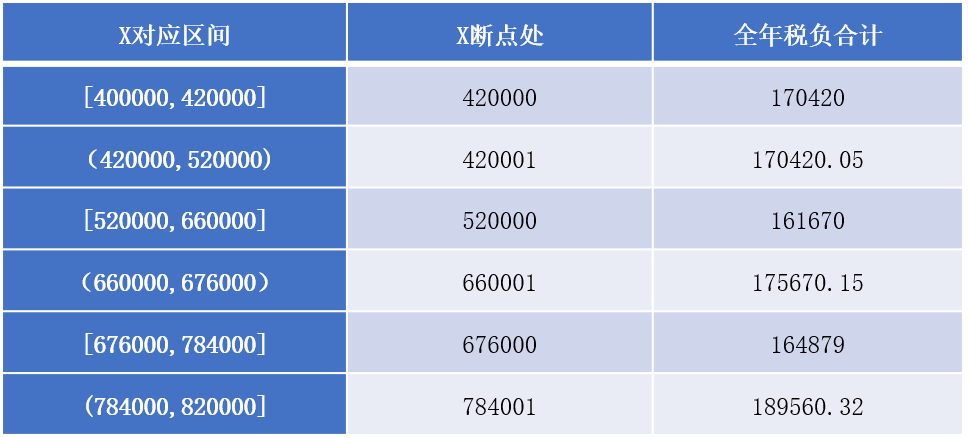 2、基于这个区间函数在每个区间内都是单调递减或递增的,实现全年税负最低或最高的点一定是处于区间的断点处;