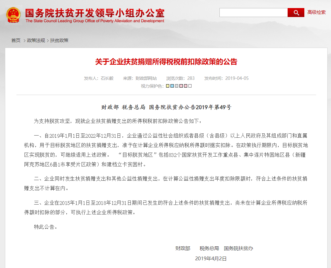 为支持脱贫攻坚,日前,财政部、税务总局、国务院扶贫办等3部门联合发布《关于企业扶贫捐赠所得税税前扣除政策的公告》,就企业扶贫捐赠支出的所得税税前扣除政策作出了明确规定。 公告规定,自2019年1月1日至2022年12月31日,企业通过公益性社会组织或者县级(含县级)以上人民政府及其组成部门和直属机构,用于目标脱贫地区的扶贫捐赠支出,准予在计算企业所得税应纳税所得额时据实扣除。在政策执行期限内,目标脱贫地区实现脱贫的,可继续适用上述政策。“目标脱贫地区”包括832个国家扶贫开发工作重点县、集中连片特困地区县(新疆阿克苏地区6县1市享受片区政策)和建档立卡贫困村。 公告指出,企业同时发生扶贫捐赠支出和其他公益性捐赠支出,在计算公益性捐赠支出年度扣除限额时,符合上述条件的扶贫捐赠支出不计算在内。 公告明确,企业在2015年1月1日至2018年12月31日期间已发生的符合上述条件的扶贫捐赠支出,尚未在计算企业所得税应纳税所得额时扣除的部分,可执行上述企业所得税政策。 本文转自央视新闻,版权归原作者所有,如有不妥,请联系处理。 |
