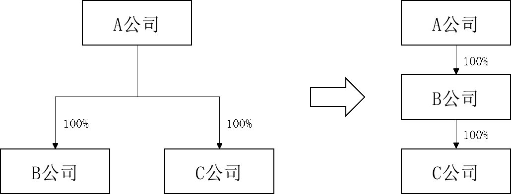 A公司分别持有B公司、C公司两家公司100%的股权,现A公司为优化股权结构,拟将C公司变更为间接持股公司,即以其持有的C公司100%股权,向B公司作价增资,增资后,A公司持有B公司100%股权,B公司持有C公司100%股权,相关股权结构变化图如下: