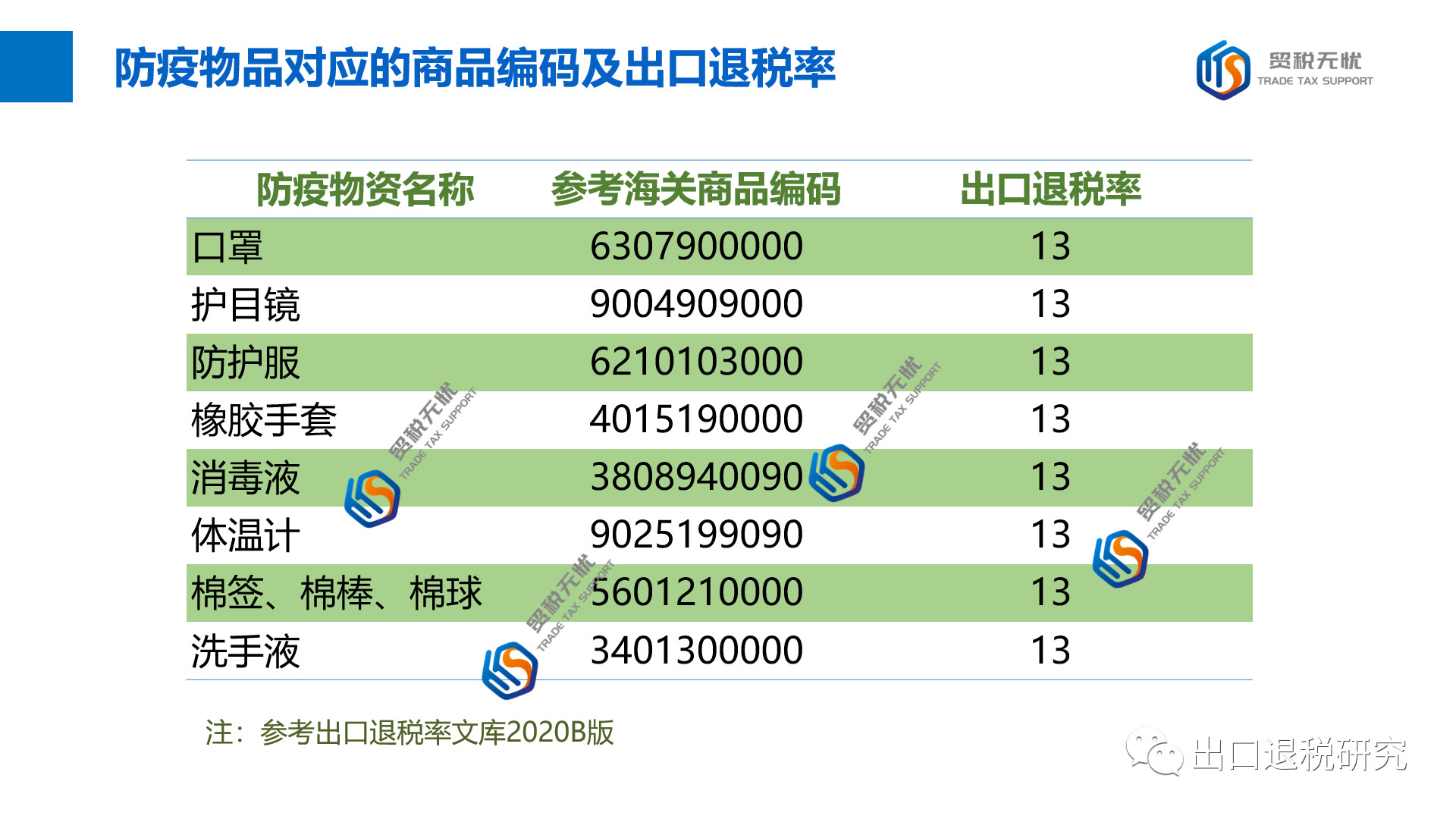 目前,口罩、防护服等防疫物品对应的商品编码及出口退税率参考如下: