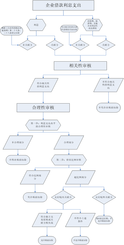 第二步:对于符合相关性的关联方借款利息支出,进行第二步的合理性审核。这里的合理性审核是一个大的原则。独立交易原则和防范资本弱化的债资比例审核都是合理性审核的内容。在合理性审核的大原则上,我们对于关联方利息支出审核又分两步进行: