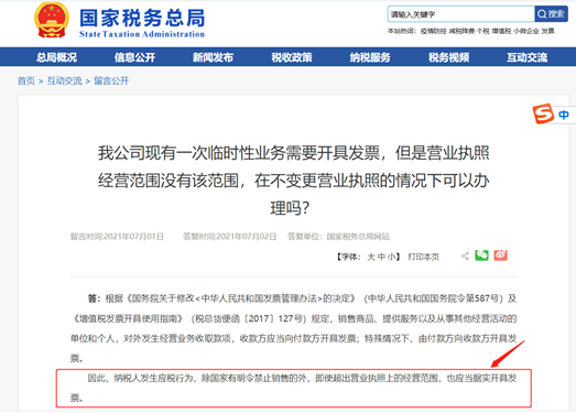 我公司现有一次临时性业务需要开具发票,但是营业执照经营范围没有该范围,在不变更营业执照的情况下可以办理吗? 因此,纳税人发生应税行为,除国家有明令禁止销售的外,即使超出营业执照上的经营范围,也应当据实开具发票。 本文转自:国家税务总局 |