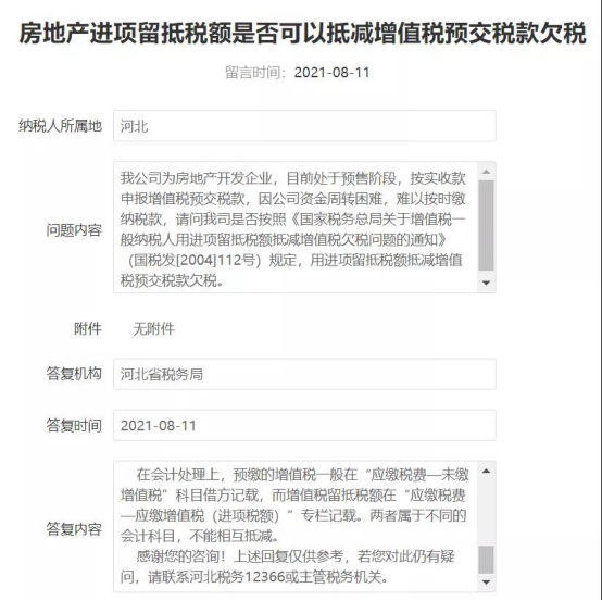 不过仔细看一下回复,就会发现河北税局的回复是:房地产开发企业的增值税留抵税额不能抵减预缴税款