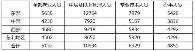 2017年不同地区不同岗位就业人员月平均工资(元/月)